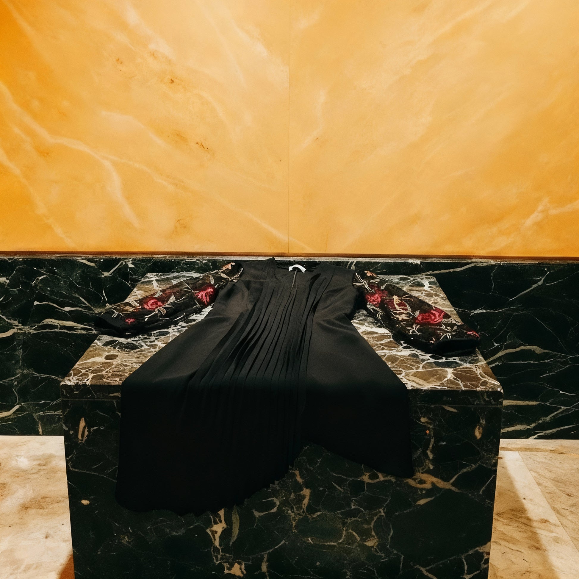 No more synthetic fabrics that make you sweat during heat waves. The sheer sleeves, adorned with hand-painted roses, are true works of art that refine your arms – crafted from natural materials that let your skin breathe when that familiar warmth rises.