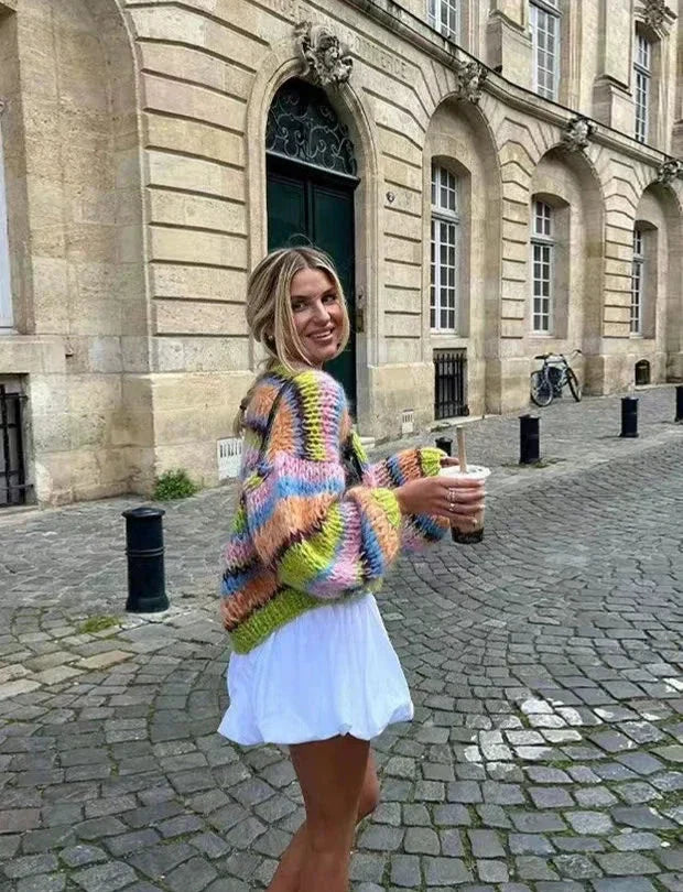 The Livia Playful Knitted Cardigan brings an exciting burst of colour and texture to your wardrobe. Its unique design and cheerful vibe make it the perfect piece to infuse a fun and lively twist into any outfit. Whether you're layering it over a casual top or pairing it with a skirt for a stylish day out, this cardigan is versatile enough for any occasion.