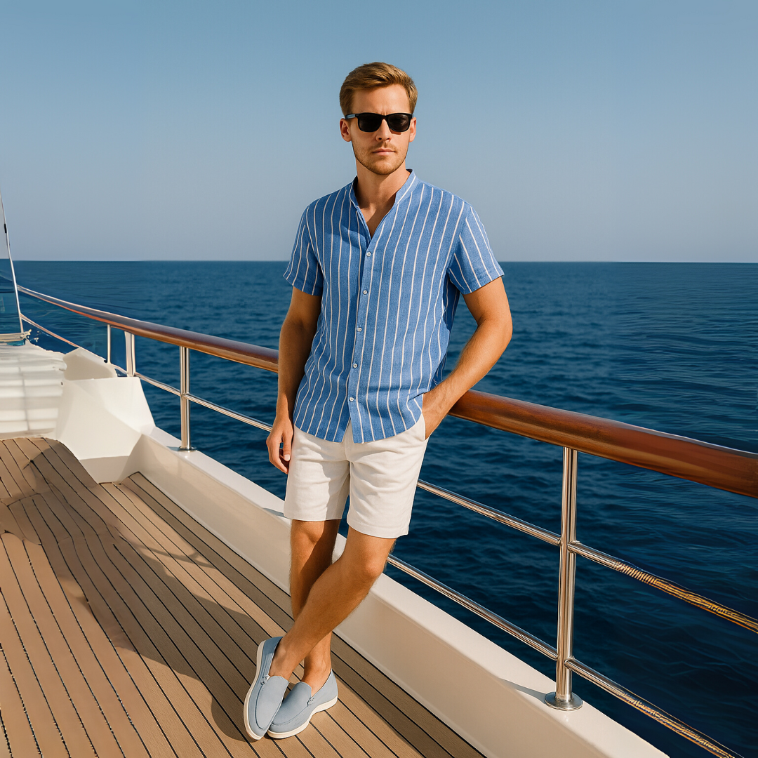 Suede Loafers - Sky Blue:Â These versatile loafers blend comfort with elegance, perfect for transitioning from the beach to a sunset dinner.